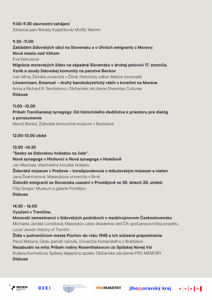Příspěvky se letos zaměří na moravsko-slovenské přesahy v rámci židovské historie Moravy. Hlavní řečník Maroš Borský představí zázračnou obnovu trenčínské synagogy. Toto město je pro rok 2026 Evropským hlavním městem kultury. Proto neváhejte přijít!