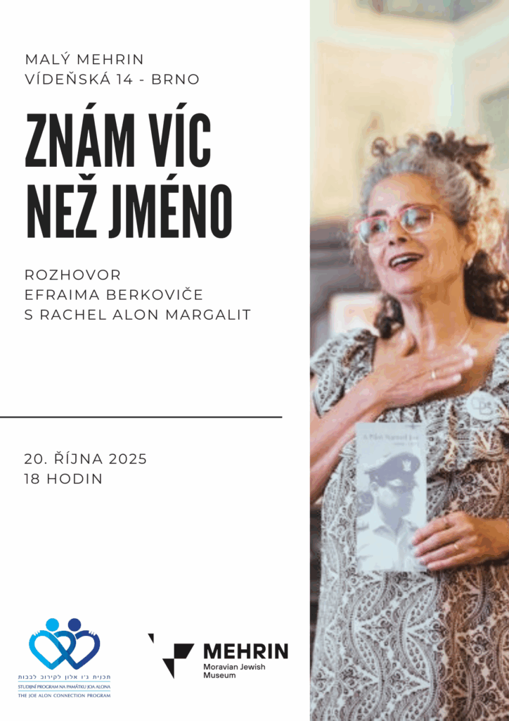 I Know More Than a Name - A Conversation between Efraim Berkovich and Rachel Alon Margalit Monday, October 20 at 6 p.m. We invite you to a unique evening during which we will touch on stories that connect personal family memory to the larger history and present. Rachel Alon Margalit will share her journey of discovering her own past - from the tragic fate of her grandparents who perished during the Holocaust, to the story of her Uncle David and Dad Joe Alon - the Winton children. The interview will also offer a glimpse of the other half of the family legacy, which Rachel received from her mother, Dvory Kirat, in Yemen. Among the topics discussed will be her relationship with her native Israel, her discovered connection to her Czech roots, and an introduction to the school education project Rachel founded in memory of her father. Rachel and Ephraim's meeting will offer a personal and social dimension and a space to reflect on how family stories intertwine with history and can inspire understanding across cultures and generations. The evening is being held as a companion programme to the exhibition Voices, which explores, among other things, the story of Rachel's grandparents, Tekla and Friedl Placzek. Admission is voluntary.